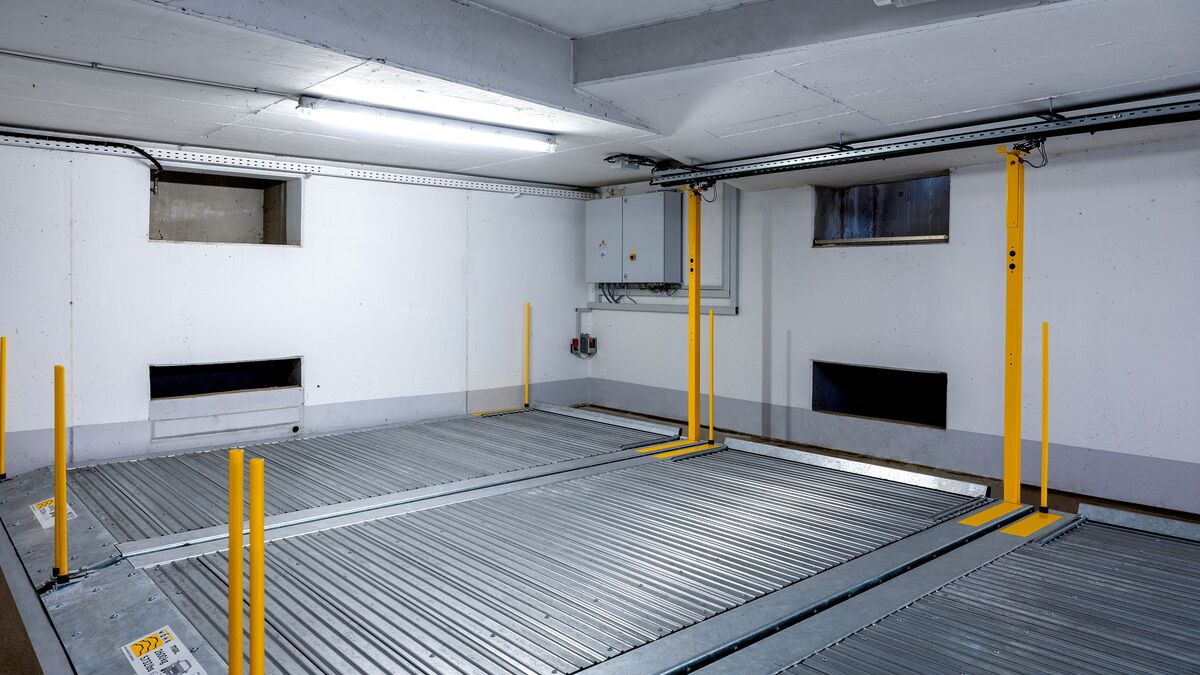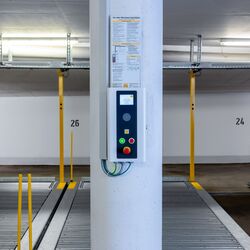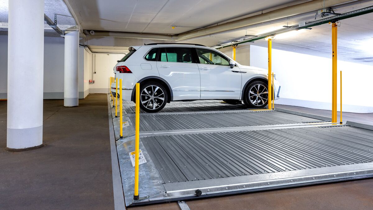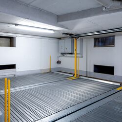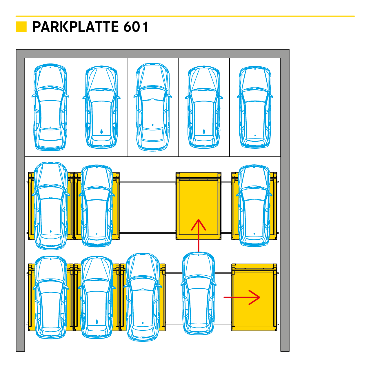Mithilfe von querverschiebbaren Parkplatten lassen sich mehrere Parkreihen hintereinander anordnen. So kann die Verkehrsfläche reduziert und toter Raum hinter Stützen genutzt werden. Die Parkplatten laufen auf Schienen und lassen sich in 2 - 4 Parkreihen direkt hintereinander anordnen. Ein Leerplatz in jeder Parkplattenreihe macht den Weg frei zum angewählten Stellplatz.