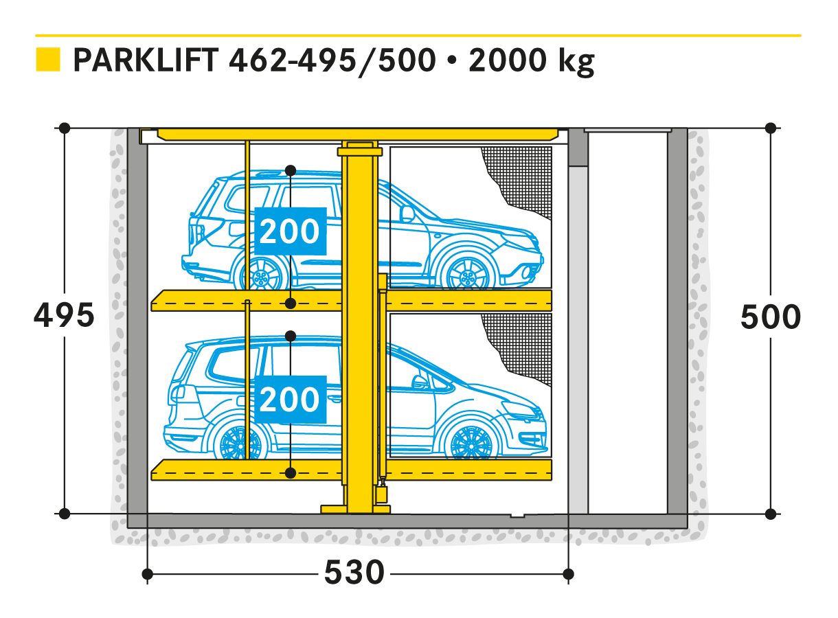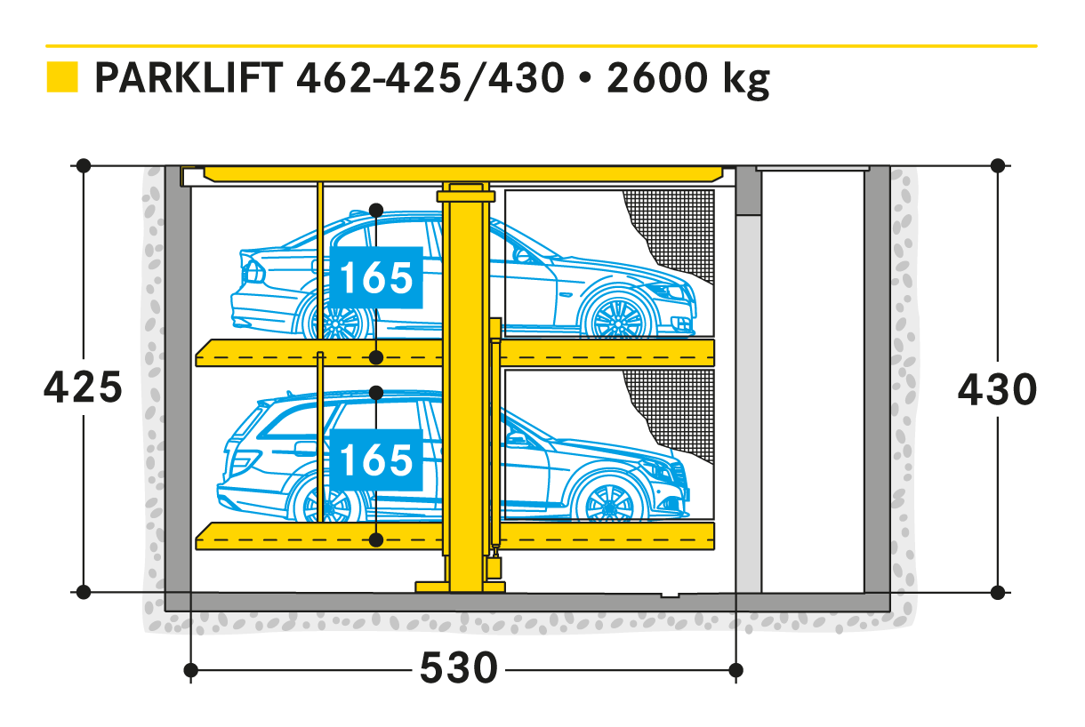 Dieses Autoparksystem wird unsichtbar in den Boden versenkt, die waagerechten unterirdischen Plattformen sind erst beim Anheben für den Ein- oder Ausparkvorgang sichtbar. Die Deckelplatte kann individuell nach Kundenwünschen belegt und so der Umgebung angepasst werden. Der Parklift 462 erfüllt seinen Nutzen bei Einbau in Hinterhöfen, Zufahrts- oder Gartenbereichen oder bei Nachrüstung von Altobjekten.
