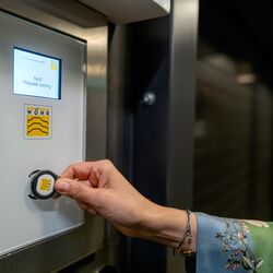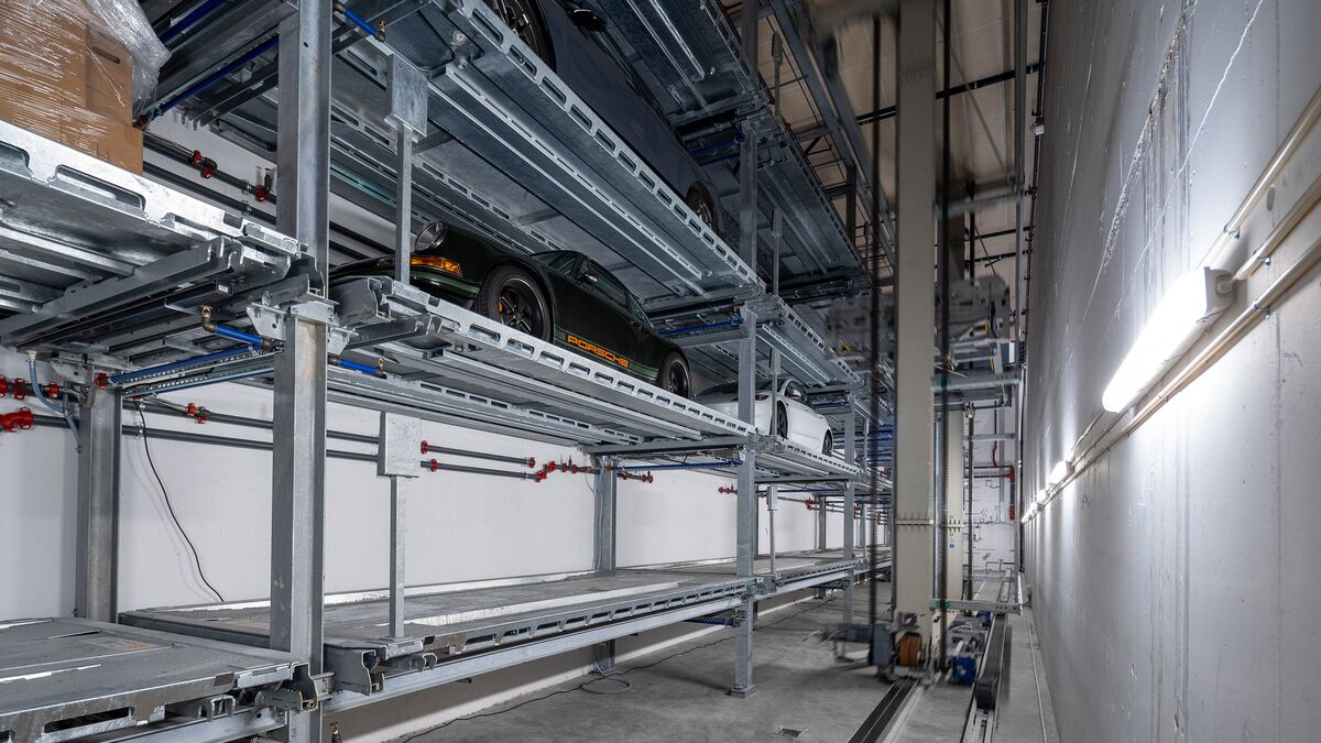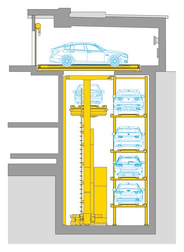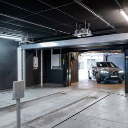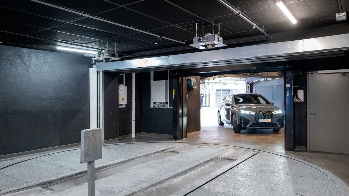 Die Parkplatzsituation stellte eine besondere Herausforderung dar, da das Grundstück vollständig bebaut war. Die Lösung kam von WÖHR Autoparksysteme GmbH: Der Multiparker 740 ermöglicht auf vier unterirdischen Ebenen die vollautomatische Unterbringung von 28 Fahrzeugen – platzsparend und effizient.Die Nutzer parken ihr Fahrzeug ebenerdig in einem hellen, modernen Übergabebereich im Inneren des Gebäudes. Eine integrierte Drehscheibe sorgt für komfortables Ein- und Ausfahren in Fahrtrichtung. Das Fahrzeug wird auf einer Palette in das unterirdische Hochregal transportiert – gesteuert über ein Bedienelement mit RFID-Chip.