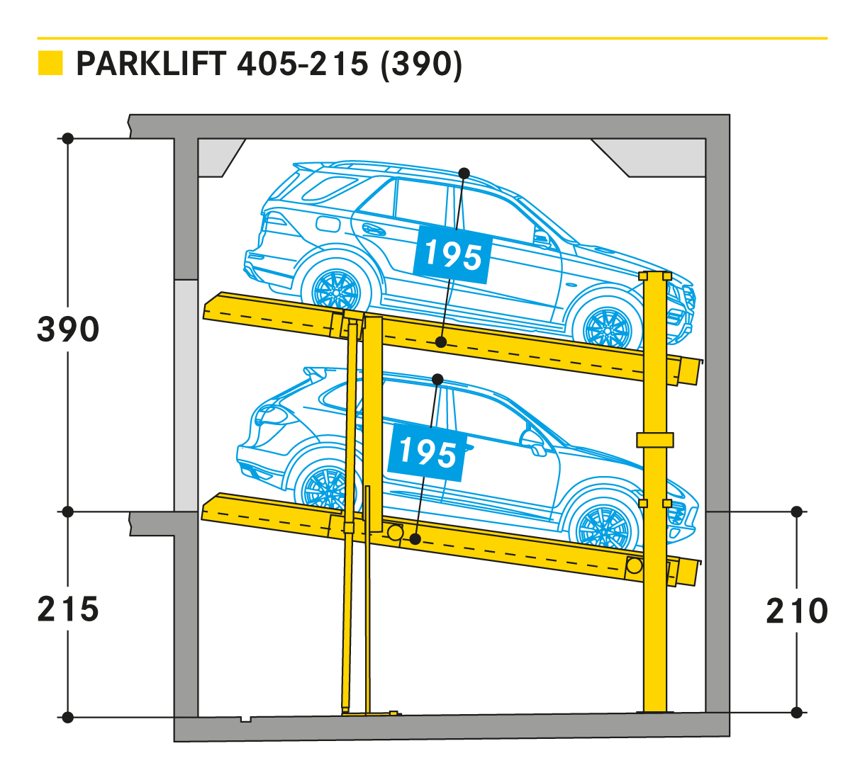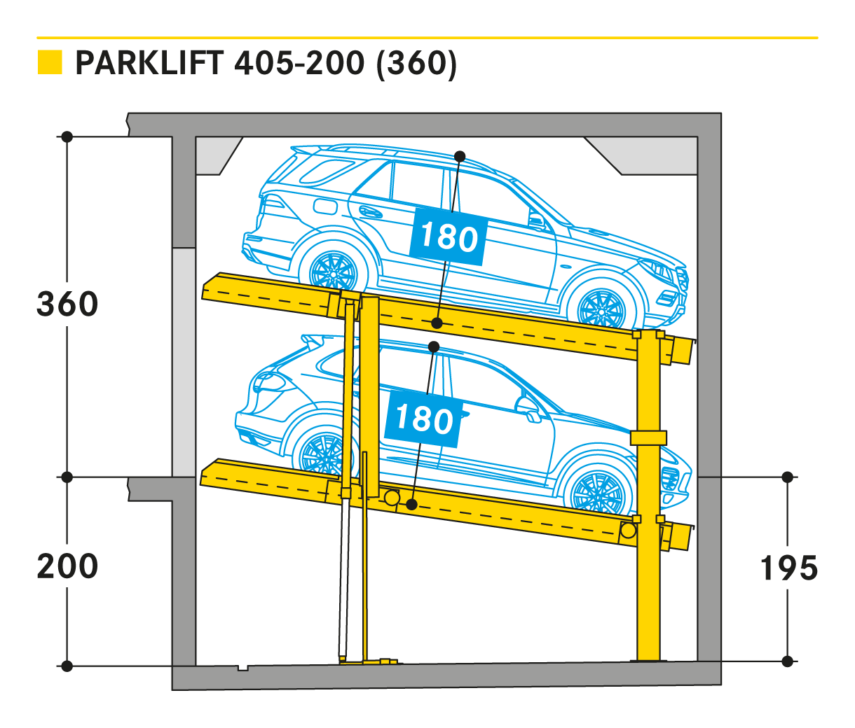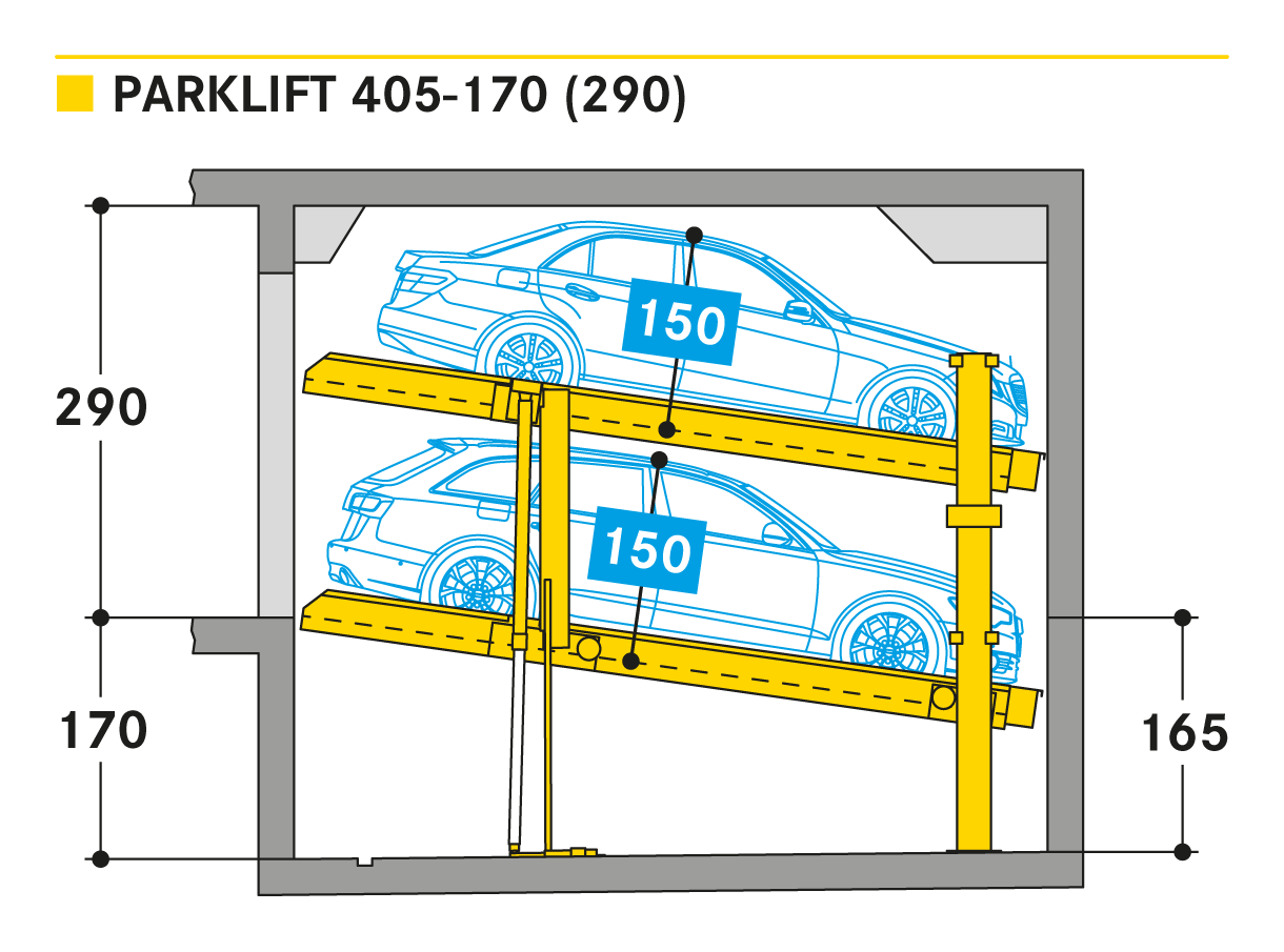 The Parklift 405 enters the market with the same innovations as the Parklift 450 and also has a further advantage. With even lower ceiling height, the same sized vehicles can be parked as in the Parklift 450, while the lower parking space is inclined. This is a response to growing car dimensions and shrinking space size. The lower platform is accessible with a gradient of 14 %. The upper platform has a minimum inclination of 2 %, which helps with drainage of the upper parking space. The single system is for 2 cars, the double system for 4 cars.