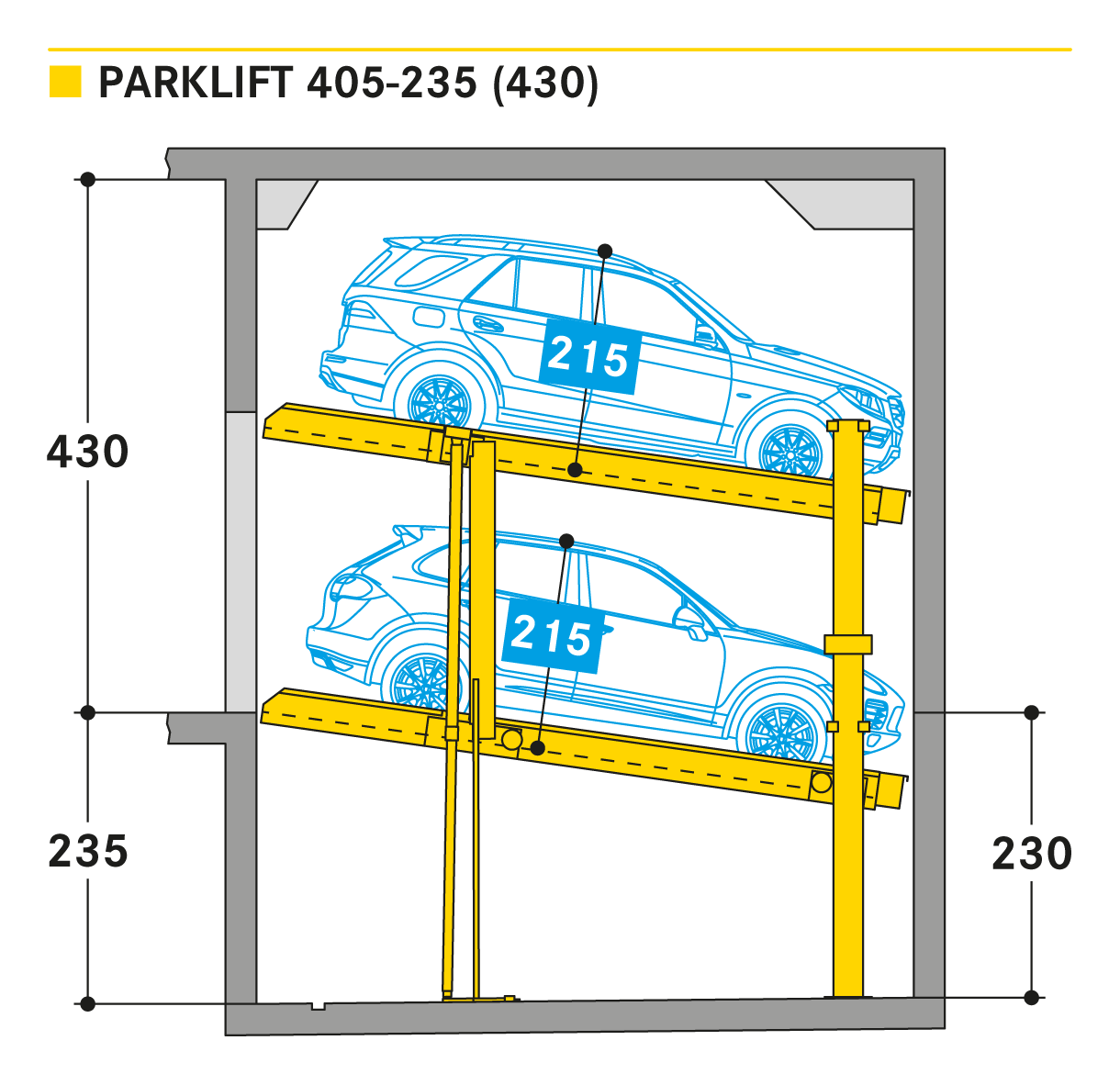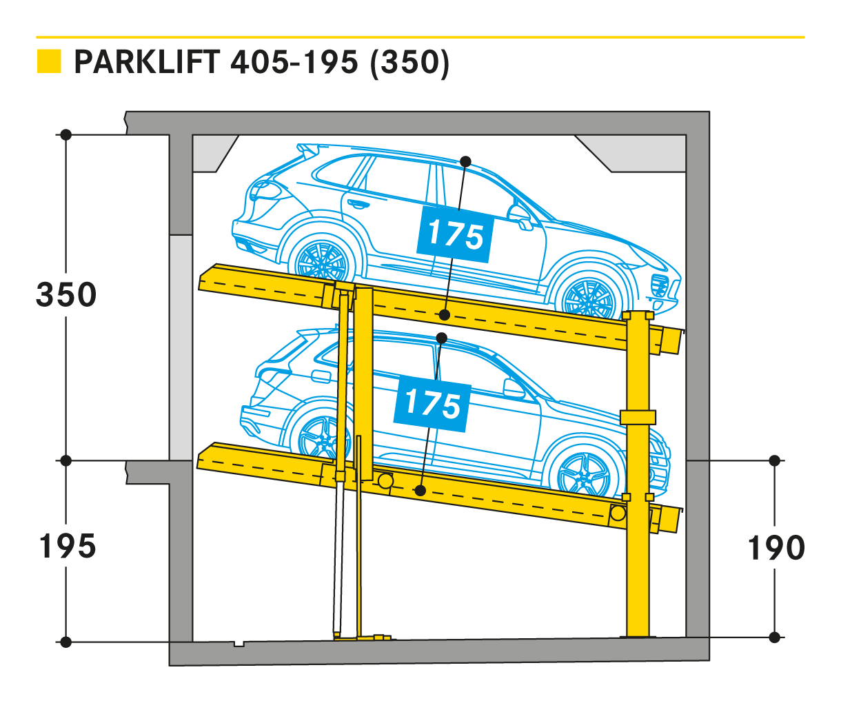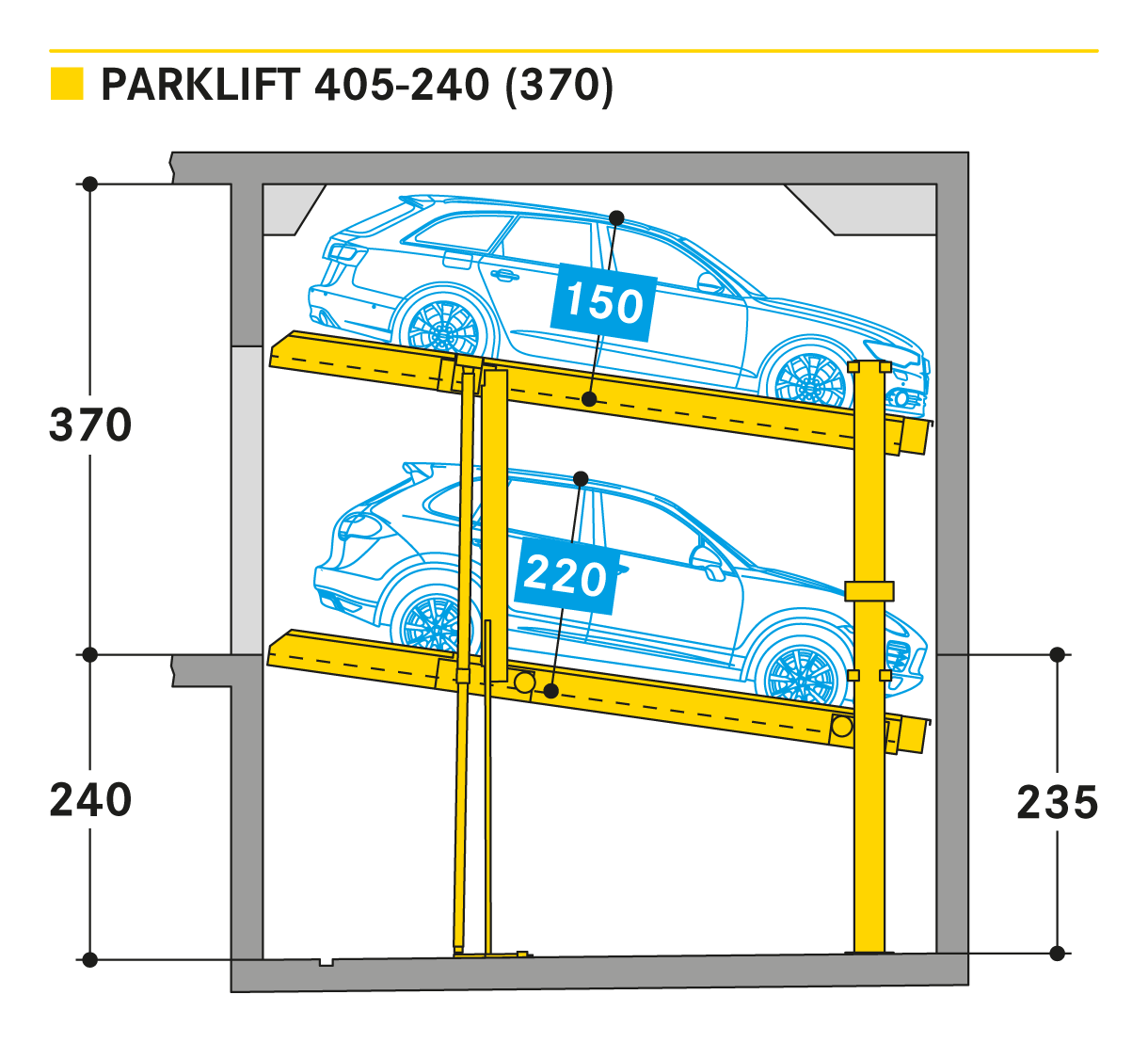 The Parklift 405 enters the market with the same innovations as the Parklift 450 and also has a further advantage. With even lower ceiling height, the same sized vehicles can be parked as in the Parklift 450, while the lower parking space is inclined. This is a response to growing car dimensions and shrinking space size. The lower platform is accessible with a gradient of 14 %. The upper platform has a minimum inclination of 2 %, which helps with drainage of the upper parking space. The single system is for 2 cars, the double system for 4 cars.