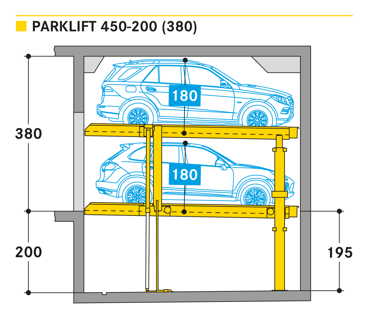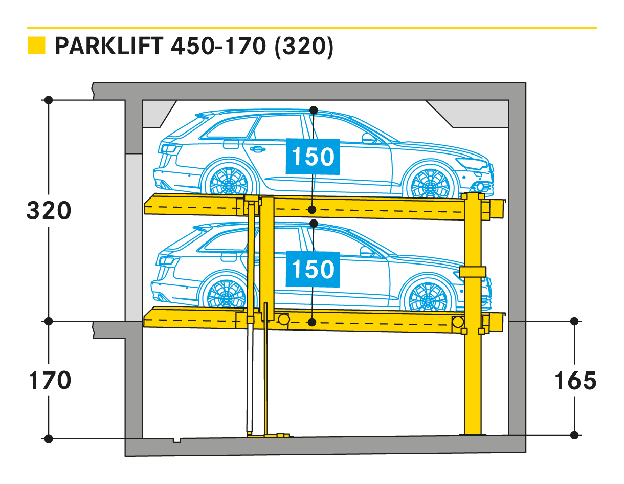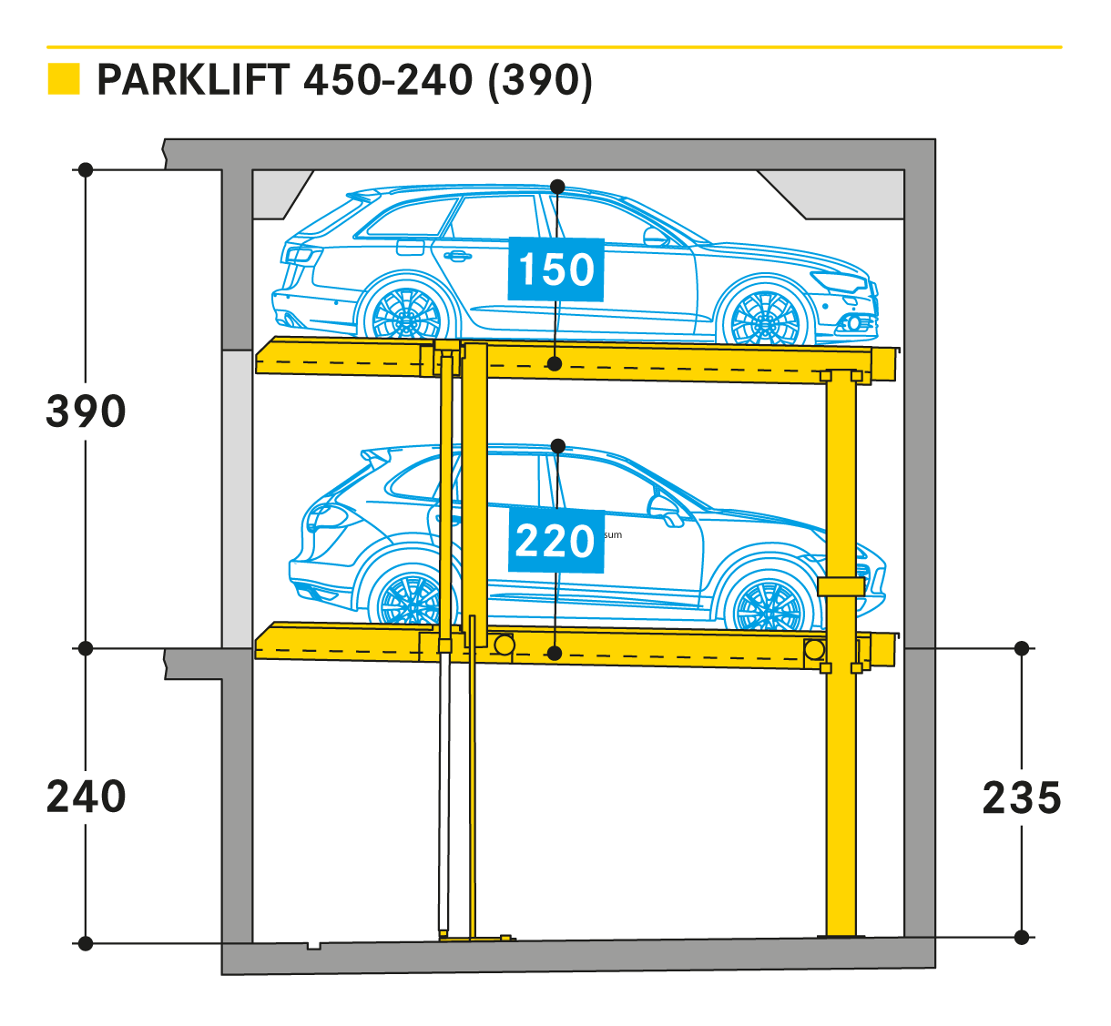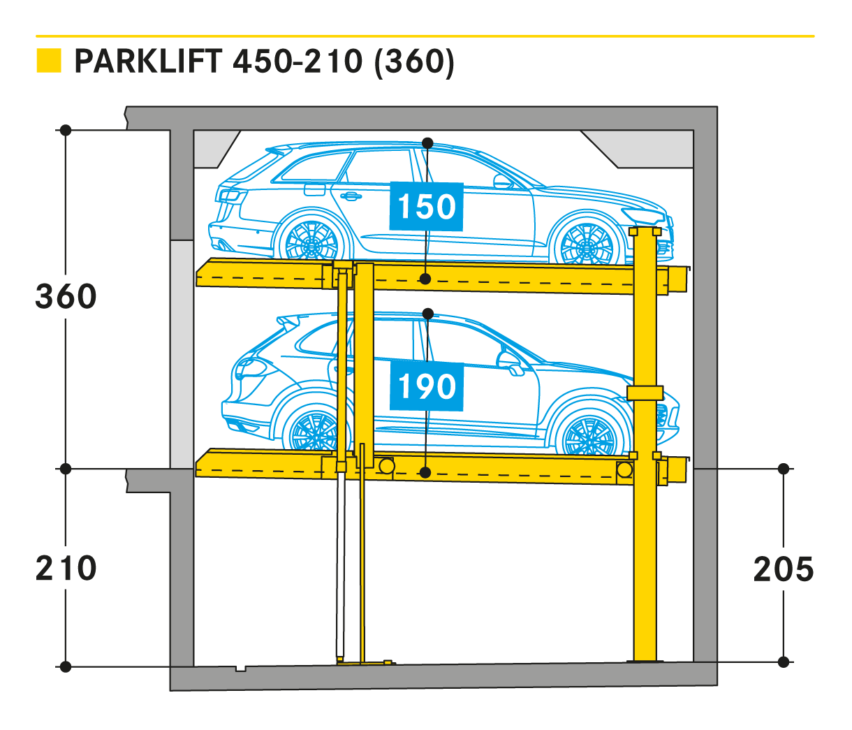 The ´Parklift 450´ also offers maximised installation dimension flexibility. Here the trend is to shift away from the rigidly set, 15 cm clearance increments in as far as the pit-depths are concerned and to move toward increased clearance flexibility. In fact, the newly designed pit depths provide for 5 cm clearance increments. Compared to predecessor models, the Parklift 450 furthermore features a clear ceiling height that is 5 cm less, without any reduction to the usual vehicle heights. How does this come about? The previous models feature an elevated platform for drainage of the water accumulating in the relative parking spaces, where the water drains down from the platform into drainage channels. The newly developed systems have done away with the elevation and have resolved the drainage issues by slightly sloping the platform giving it a minimal, 2 % inclination. The single systems are engineered for 2 cars, the double systems for 4 cars.