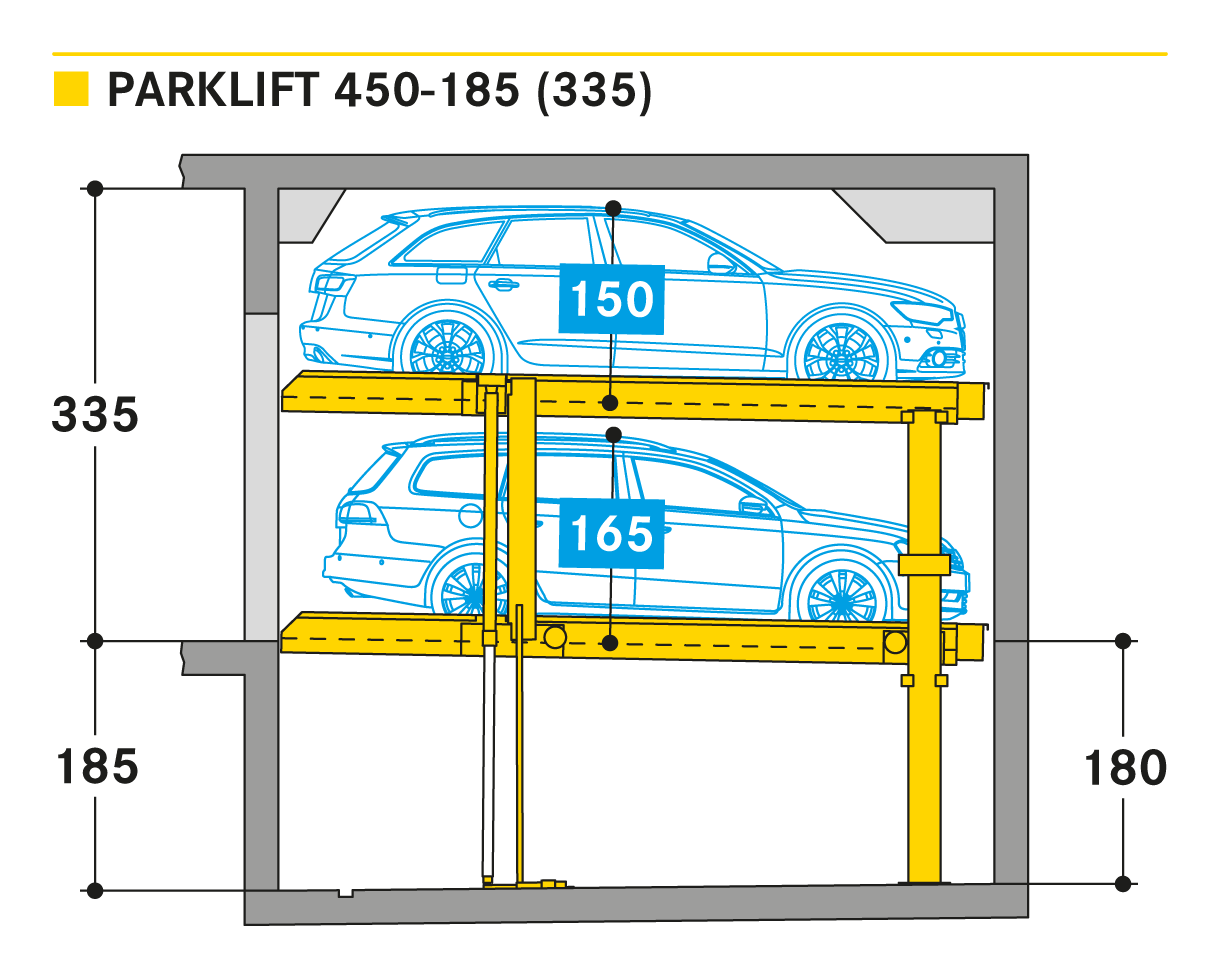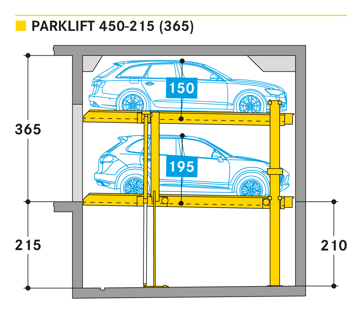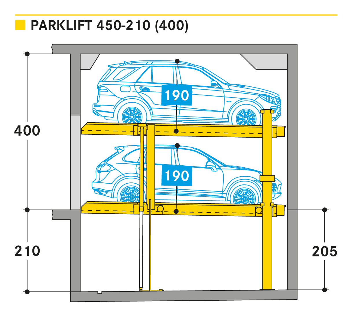 The ´Parklift 450´ also offers maximised installation dimension flexibility. Here the trend is to shift away from the rigidly set, 15 cm clearance increments in as far as the pit-depths are concerned and to move toward increased clearance flexibility. In fact, the newly designed pit depths provide for 5 cm clearance increments. Compared to predecessor models, the Parklift 450 furthermore features a clear ceiling height that is 5 cm less, without any reduction to the usual vehicle heights. How does this come about? The previous models feature an elevated platform for drainage of the water accumulating in the relative parking spaces, where the water drains down from the platform into drainage channels. The newly developed systems have done away with the elevation and have resolved the drainage issues by slightly sloping the platform giving it a minimal, 2 % inclination. The single systems are engineered for 2 cars, the double systems for 4 cars.