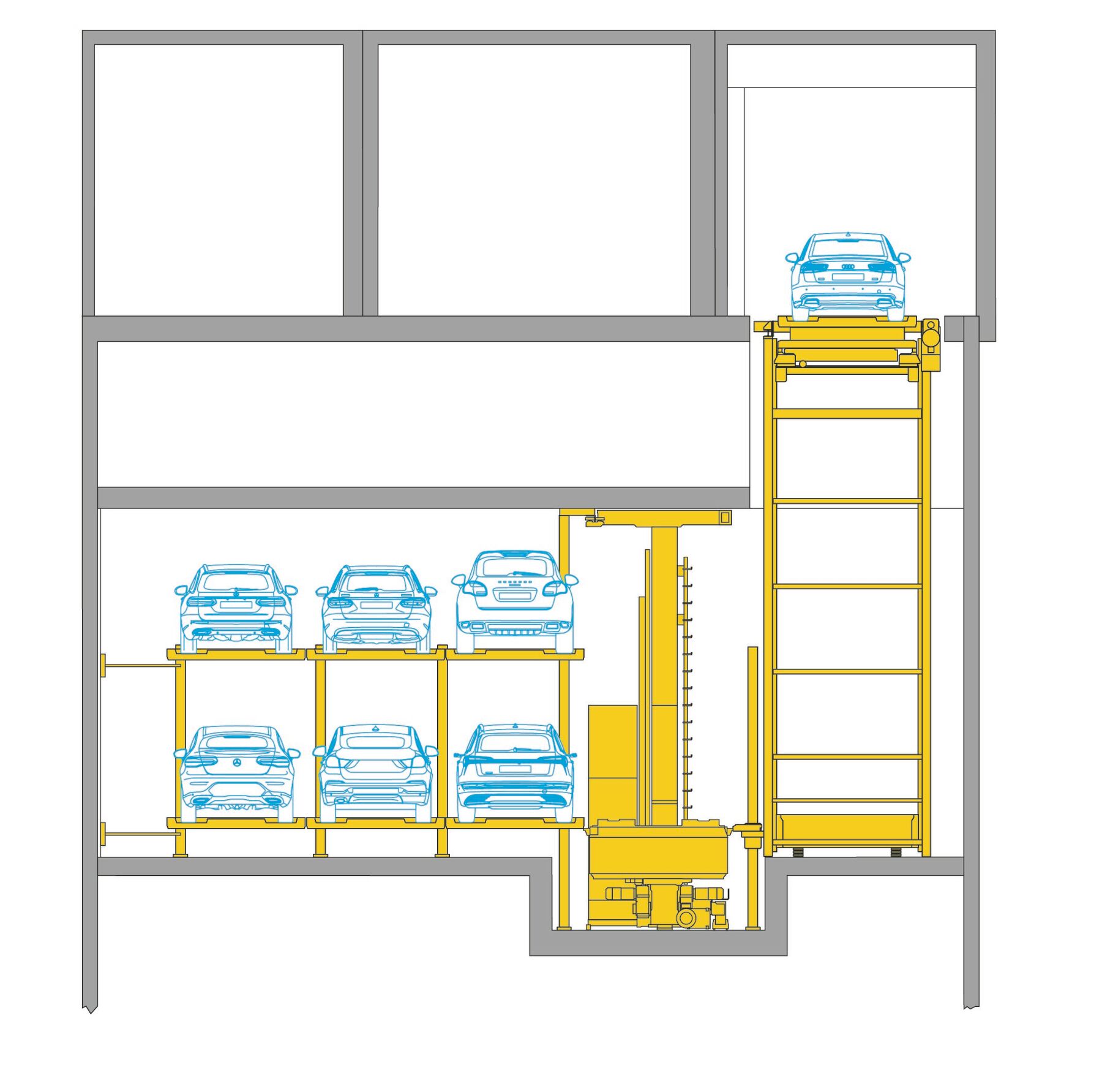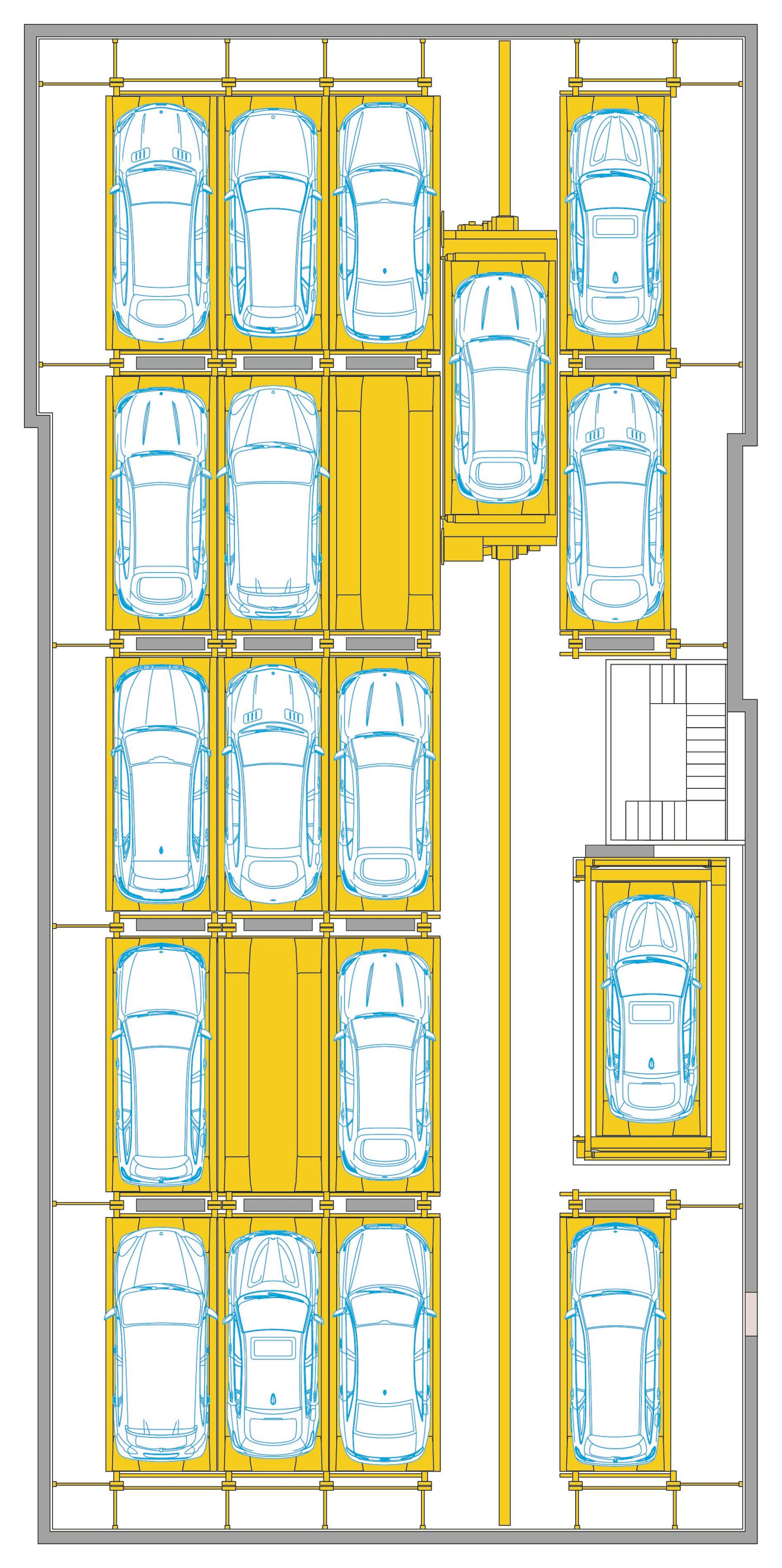 - 2 parking levels with 4 parking rows each
