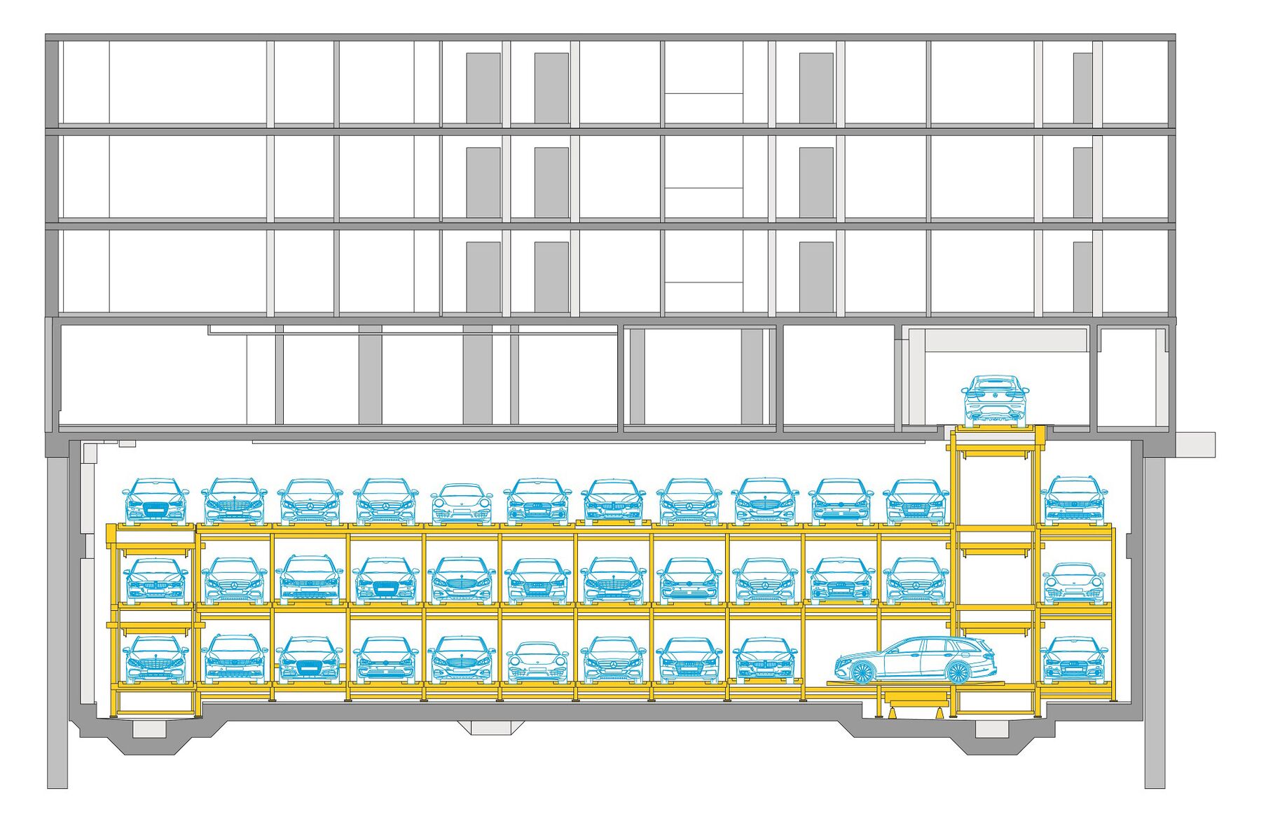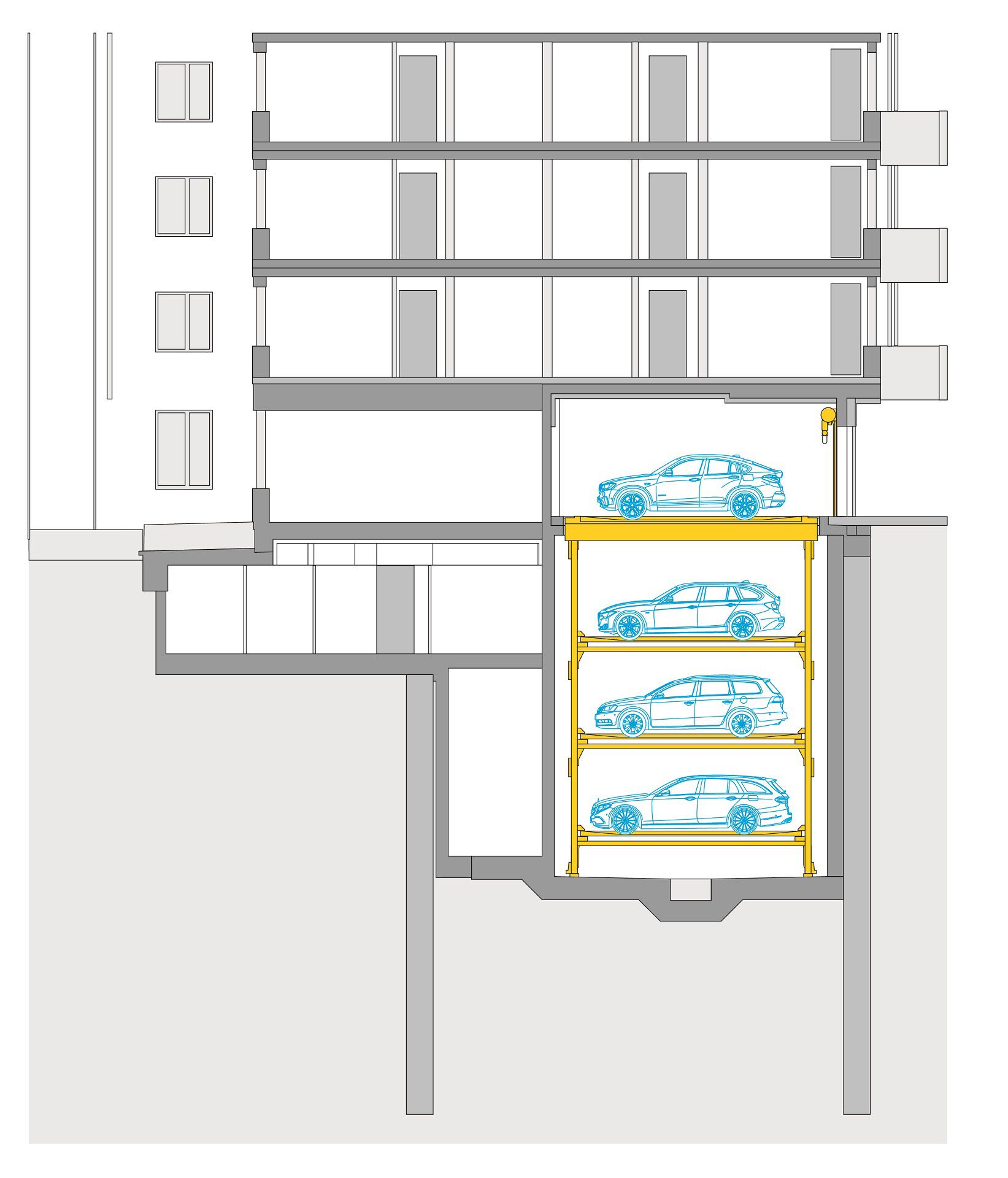 The installed Levelparker 590 offers residents 36 parking spaces on 3 underground parking levels. The total parking area of approx. 213 m² is thus optimally used, so that only approx. 5.90 m² are required per parking space.